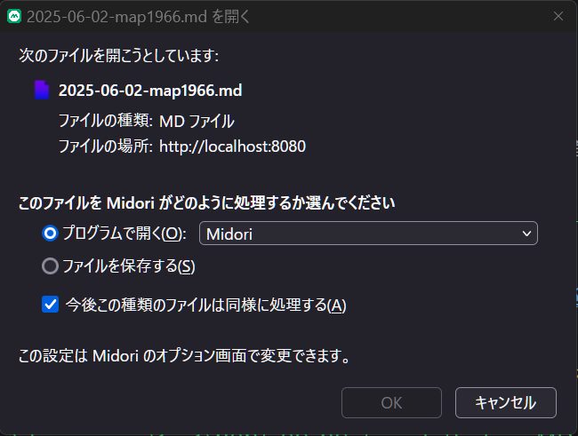 (download したファイル種別毎に起動アプリを設定可能なブラウザであれば)"markdown viewer"(ブラウザ用 addon )経由で表示してよいかどうかをユーザに確認する pop-up 画面(下がその具体例)が 「毎回常に」 表示される。