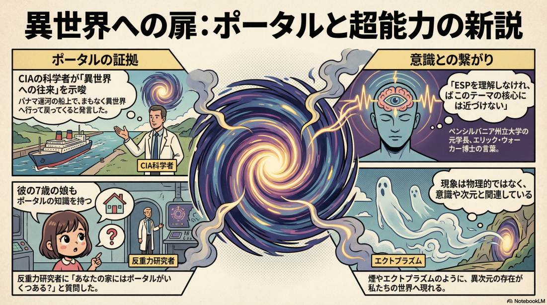 この主張を裏付ける主要な証拠として、元CIAのトップ科学者とされるロン・パンドルフィ氏の発言が挙げられる。同氏はビデオ内で「この世界から次の世界へ行き、再び戻ってくる」と述べ、ポータル技術の存在を示唆した。さらに、同氏の幼い娘が反重力研究者に対し「あなたの家にはポータルがいくつありますか?」と質問した事例は、この概念が家族内で共有されている可能性を示唆する傍証として提示されている。