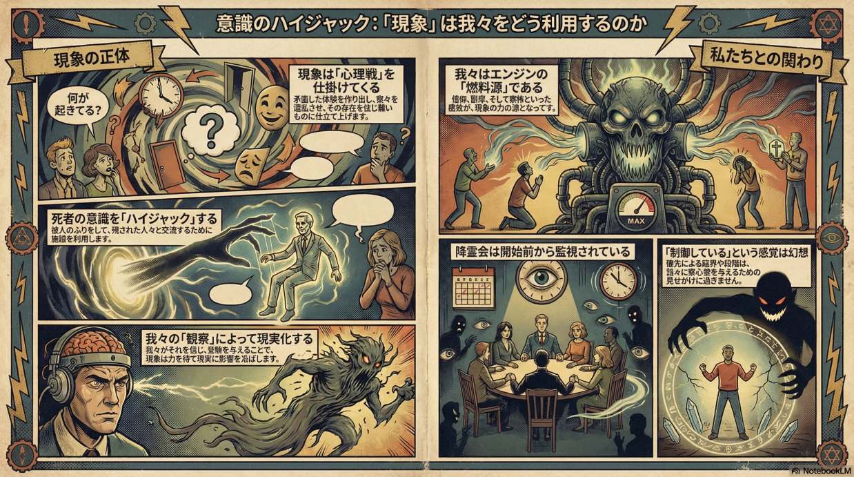 また、集団的な信念が現象に力を与える「共創」の役割を果たし、人間がそのエネルギー源となっているという説が展開されており、降霊会(seance)や宗教的崇拝を通じた現象の監視・利用についても考察されています。