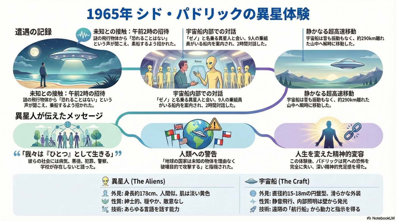 本資料は、シド・パドリックが1965年に経験した宇宙人との遭遇について語った講演の書き起こしであり、彼が未確認飛行物体に搭乗した経緯を詳細に記録しています。