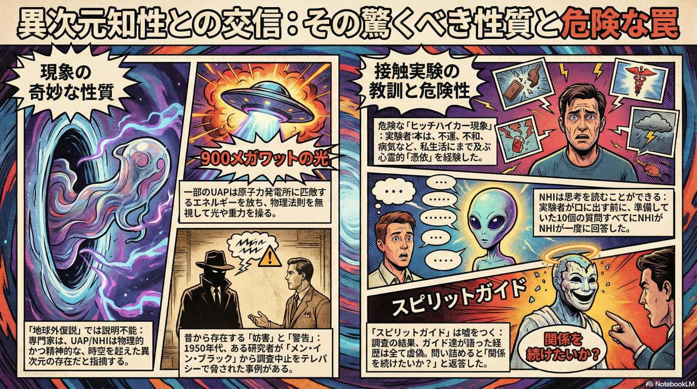 このポッドキャストの文字起こしは、未確認空中現象(UAP)と非人間的知性(NHI)との秘密裏に行われた交信実験、およ び関連する超常現象に関する広範な議論を提供します。