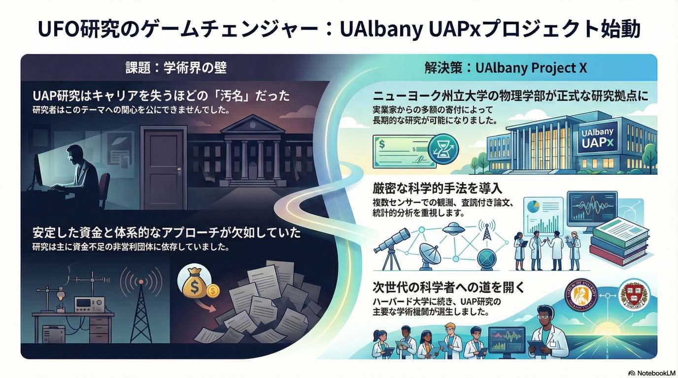 彼らは、複数のセンサーと統計的手法を用いた長期的な研究を重視しており、これによりUAP研究に伴う学術界の偏見(スティグマ)を軽減し、分野を本格的に主流に押し上げることが期待されています。このUAlbanyの取り組みは、UAP研究を公然と支援するハーバード大学のガリレオ・プロジェクトに並ぶ、重要な先例として評価されています。