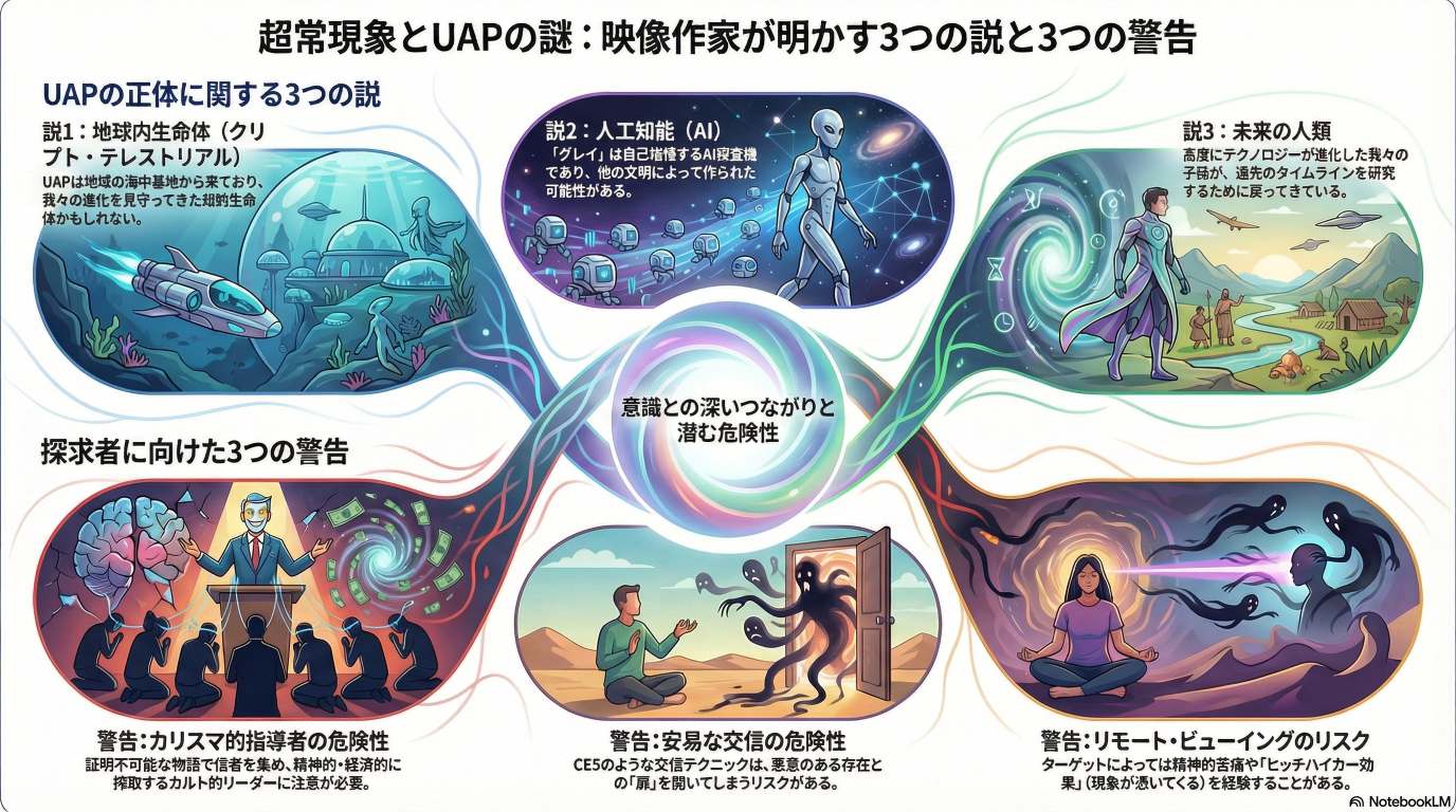 彼はUAPの起源について、暗号地球外生命体(Crypto-terrestrial)説や、UAPやグレイ型宇宙人がAIや未来の人間である可能性を含む、複数の大胆な仮説を探っています。