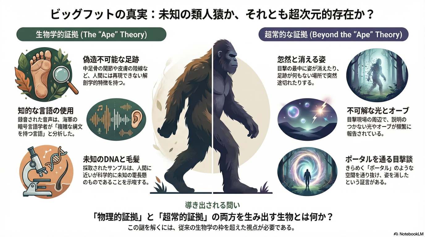 本ブリーフィングは、このドキュメンタリーと関連する分析から得られた核心的な洞察をまとめたものである。主要な結論として、サスカッチ現象は、物理的に検証可能な証拠と、一貫して報告される超常的・非物理的な証拠の両方を同時に内包している。足跡、毛髪、DNA、音声記録といった「硬い証拠」が存在する一方で、消失、ポータル、光球、テレパシーといった、既知の生物学では説明不可能な事象が、信頼性の高い目撃者によって多数報告されている。