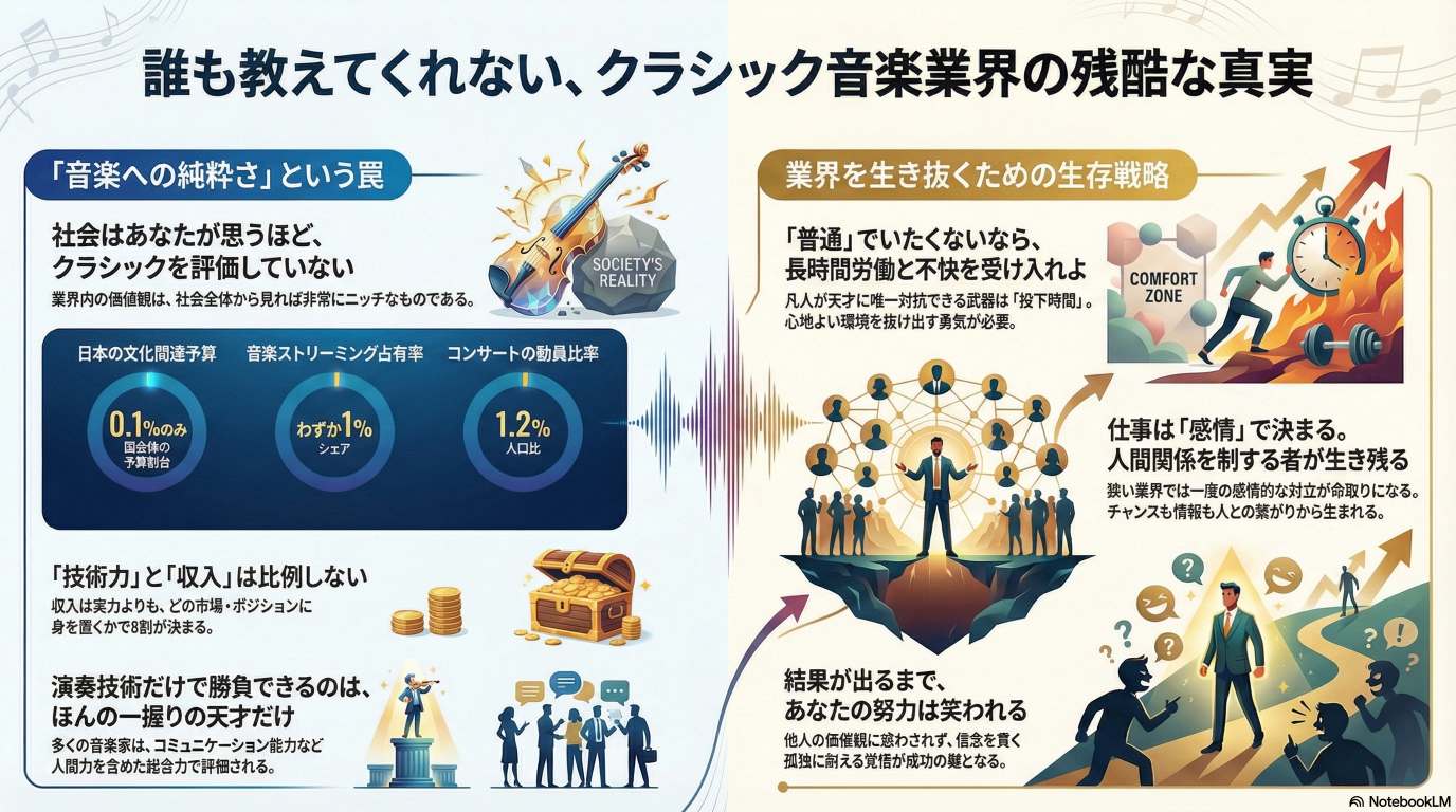 この動画は、クラシック音楽業界でのキャリアを志す人々に対し、成功するために知っておくべき「残酷な真実」10選を具体的に解説する内容です。具体的には、「音楽への純粋さ」と社会とのギャップ、長時間労働の必要性、快適な状態(コンフォートゾーン)からの脱却、人間関係の重要性、感情的な衝突の回避、演奏スキル以外の要素(人間性や戦略)が収入やキャリアに大きく影響することなどが語られています。