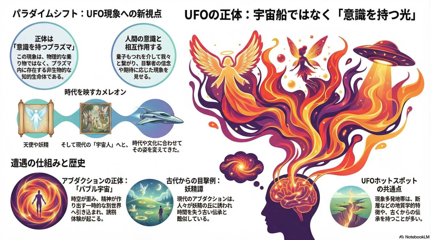 Andrew Collins : UFO の正体は「意識を持つ光」2025年12月15日 · 約172分 (全体俯瞰 : AI 生成) click で拡大 前置き 過去記事、 Andrew Collins:Rendlesham Forest では数百年前から謎の光や怪奇生物が目撃されていた | UFO/Bigfoot/Missing-411/Supernatural Research の動画を AI(NotebookLM) で整理した。 Andrew Collins の UFO = 光/プラズマ (orb) までは妥当だが、彼はそこから一気に 意識を持つプラズマだの、量子もつれだの、別次元だの へと逸脱して、地下迷宮に突入している。 目次 前置き 要旨 アンドリュー・コリンズの「ライトクエスト」に関するブリーフィング エグゼクティブ・サマリー 序論:UFO現象への新たなアプローチ 中核理論:プラズマ生命体と意識の相互作用 現象の擬態と歴史的連続性 結論:「ライトクエスト」の目的