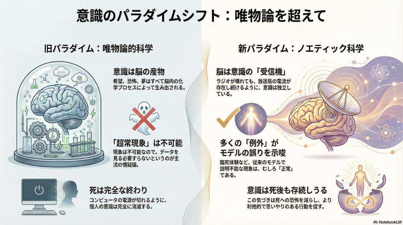 両者は、科学的証拠の蓄積によって、人類の意識に対する理解が今後数十年で劇的に変化し、より相互接続的で慈悲深い社会へと変容することへの期待を示しています。