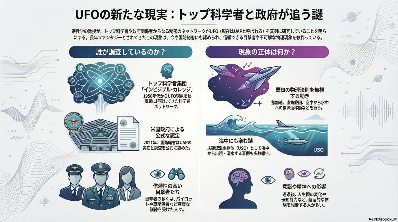 このブリーフィング・ドキュメントは、宗教学者であるダイアナ・ウォルシ ュ・パスルカ博士のインタビューに基づき、未確認異常現象(UAP)、通称UFOに関する核心的なテーマと洞察をまとめたものである。パスルカ博士は、盲目的な肯定も冷笑的な否定も避け、学術的な厳密さをもってこの現象を理解しようとする「中道」のアプローチを提唱している。