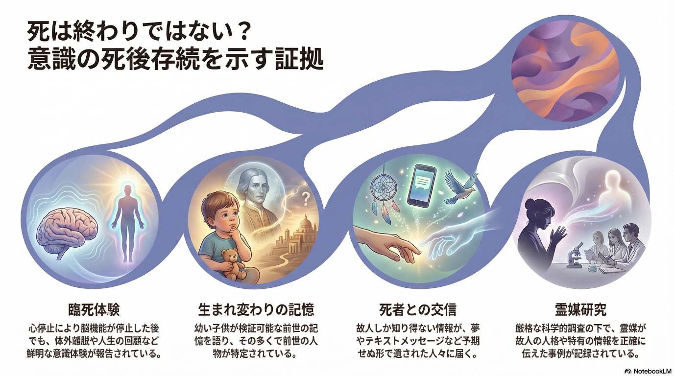 提供された資料は、死後の意識の生存を証明しようとする多角的な研究や実体験をまとめたものです。