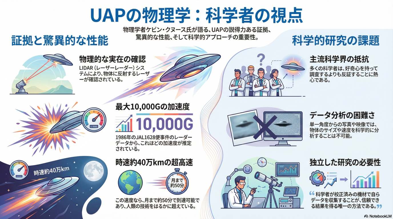 本ブリーフィングは、物理学者ケビン・クヌース博士が未確認異常現象(UAP)について概説した内容をまとめたものである。アルバニー大学の物理学教授であるクヌース博士は、2018年以降、UAPの研究に積極的に関与しており、UAPは実在し、物理的な物体であり、人類の技術をはるかに超える飛行特性を示すと確信している。
