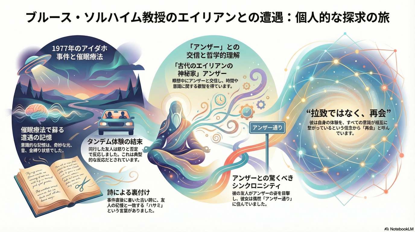 ブルース・ソールハイム教授の「エイリアンとの遭遇と意識の探求」という大きな文脈において、ソースは、彼の個人的な体験を検証し、理論的に枠付け、そして精神的に支える‌‌多様な人物や組織との繋がり‌‌を明らかにしています。