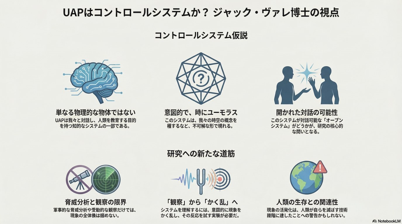 Vallee 博士は自身の著書『禁断の科学』シリーズに触れ、UAP(未確認異常現象)を単なる物理的物体ではなく、人類を教化する「制御システム」や「メタシステム」として捉える独自の視点を提示しています。