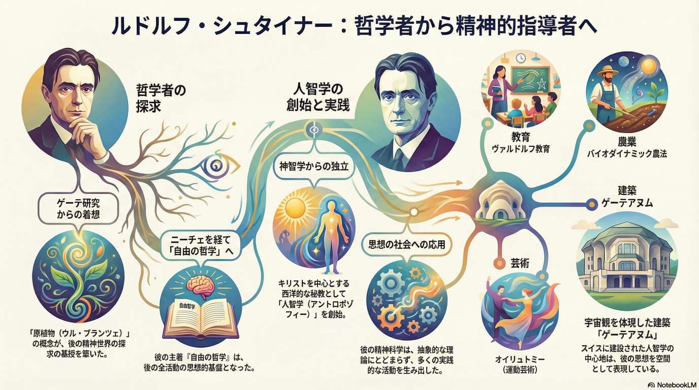 神智学協会ドイツ支部の指導者を経て、シュタイナーは独自の運動「人智学(アントロポゾフィー)」を創設した。これは、キリストの受肉を人類史の中心に据える、人間中心の霊的探求の道である。彼の思想は哲学にとどまらず、ヴァルドルフ教育、バイオダイナミック農法、建築(ゲーテアヌム)、芸術(オイリュトミー)、医学、政治思想(社会三分節化論)といった極めて実践的な分野へと展開し、今日でも世界中で広範な影響力を持っている。シュタイナーの思想体系は、ルシファー(霊的傲慢)とアーリマン(唯物論的鈍重さ)の二つの対極的な力の間に立つ キリストの姿を人間の理想として描き出し、「境域の守護者」との対峙といった秘儀参入のプロセスを重視する。その莫大な創造性と影響力にもかかわらず、彼の人物像は限りなく忍耐強く、他者への奉仕に生涯を捧げた穏やかな人物として伝えられている。