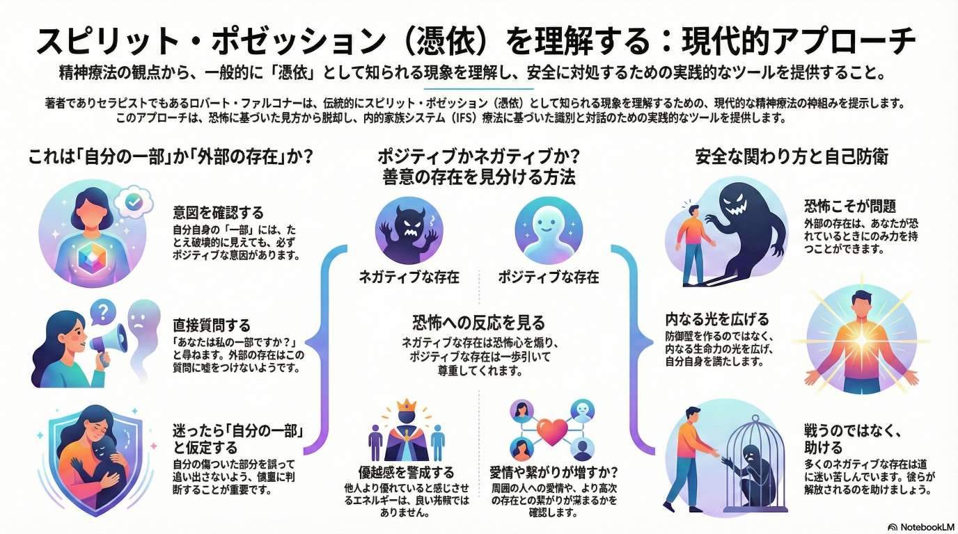 Falconer 氏は、憑依を単なる悪として排除するのではなく、自己の「パーツ」と外部の存在を見極め、恐怖心を取り除き対話を通じて癒しをもたらすアプローチを提唱しています。