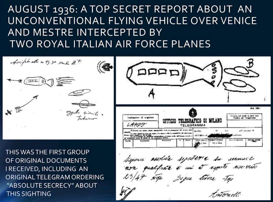 | 1936年 | ヴェネツィア、メストレ | 細長い魚雷のような物体が、「司祭の帽子」のような形をした2つの小型物体を伴って飛行。イタリア空軍の戦闘機2機が追跡を試みたが失敗した。 |