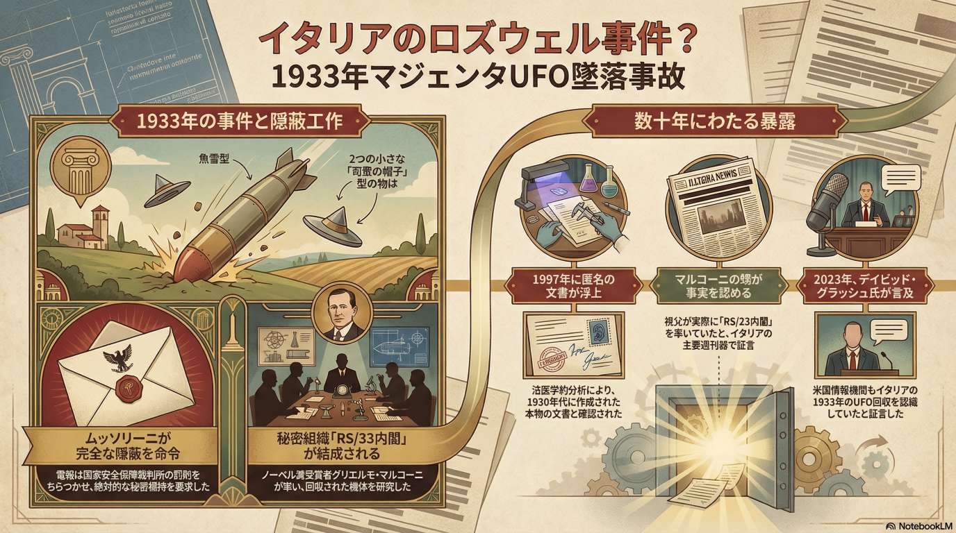 本ブリーフィングは、ロベルト・ピノッティ氏がThe Sol Foundationで行った講演内容を統合したものである。中心的なテーマは、1933年にイタリアのマジェンタ近郊で発生した未確認飛行物体(UAP)の墜落事件と、それに対するムッソリーニのファシスト政権による徹底した隠蔽工作である。ピノッティ氏らが25年以上前に発表したこの研究は、2023年のデイビッド・グラッシュ氏の証言によって完全に裏付けられた。