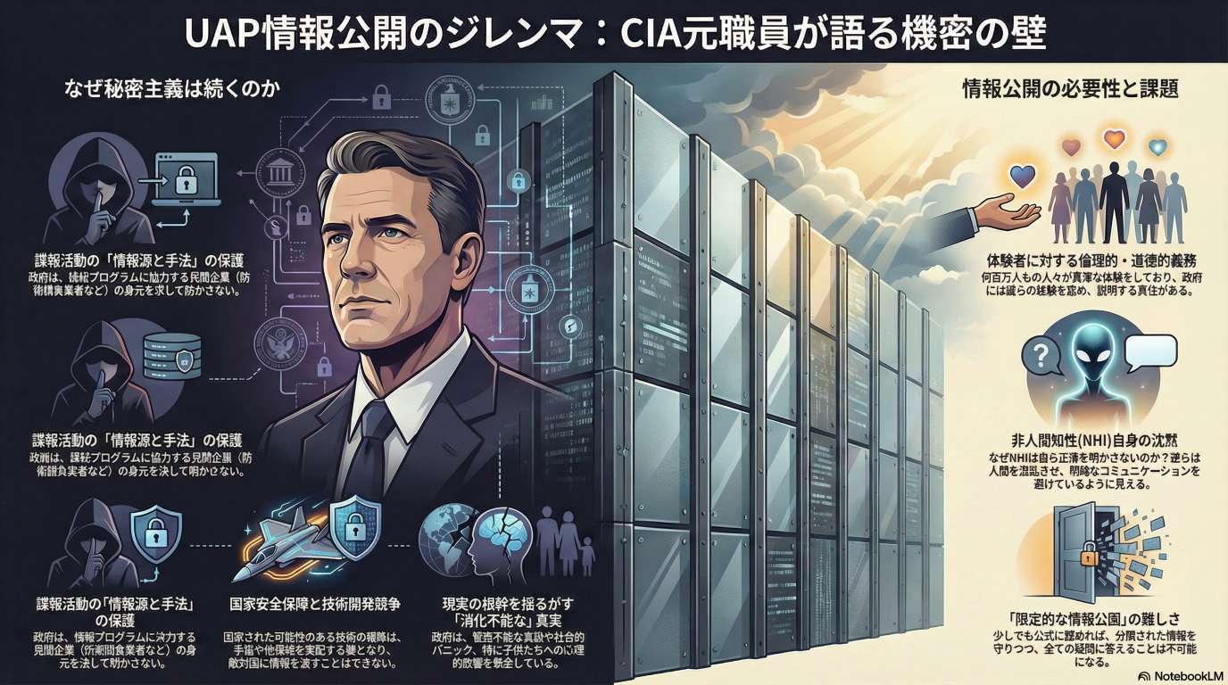 元CIA工作官の Jim Semivan 氏が、ソル財団のフォーラムにてUAP(未確認異常現象)に関する政府の情報公開や非人類知性について語っています。セミヴァン氏は、機密保持や民間企業との契約関係が障壁となり、政府が情報を完全に開示することは極めて困難であると指摘しています。また、自身や家族の不可解な体験を告白し、現象には物理的な側面だけでなく、意識や心理的要素が深く関わっている可能性を論じています。さらに、UAPの真相は既存の現実観を覆すほど「消化不良」で衝撃的な内容であるかもしれないと推測しています。この対話は、国家安全保障の観点と、人類が未知の現実にどう向き合うべきかという倫理的問いを浮き彫りにしています。
