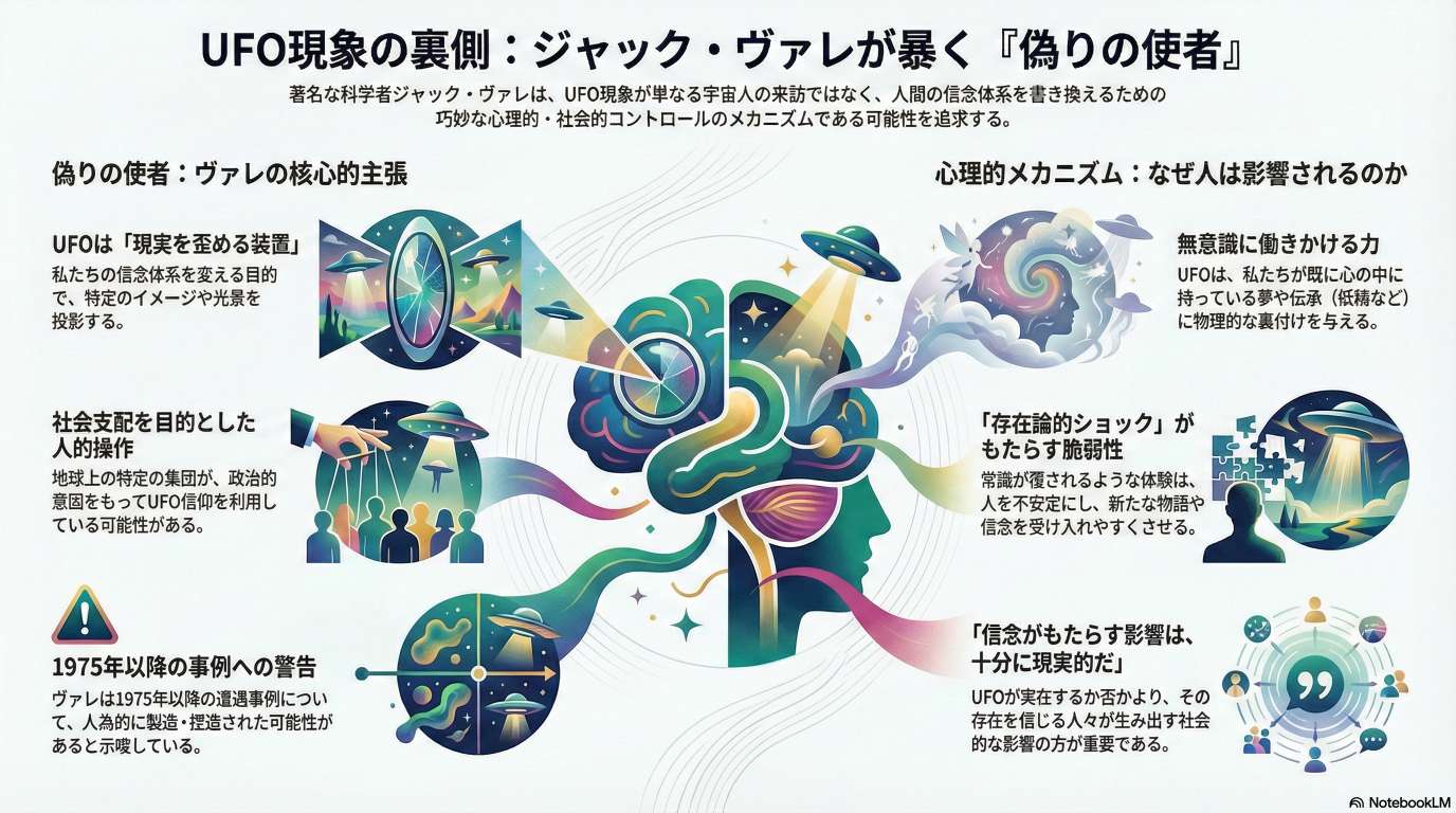 このソースは、ポッドキャスト『The Great Dangerous Books Podcast』の書き起こしであり、 Jacques Vallee の著書『騙しのメッセンジャー』を軸に、UFO現象の背後にある複雑な構造を考察しています。