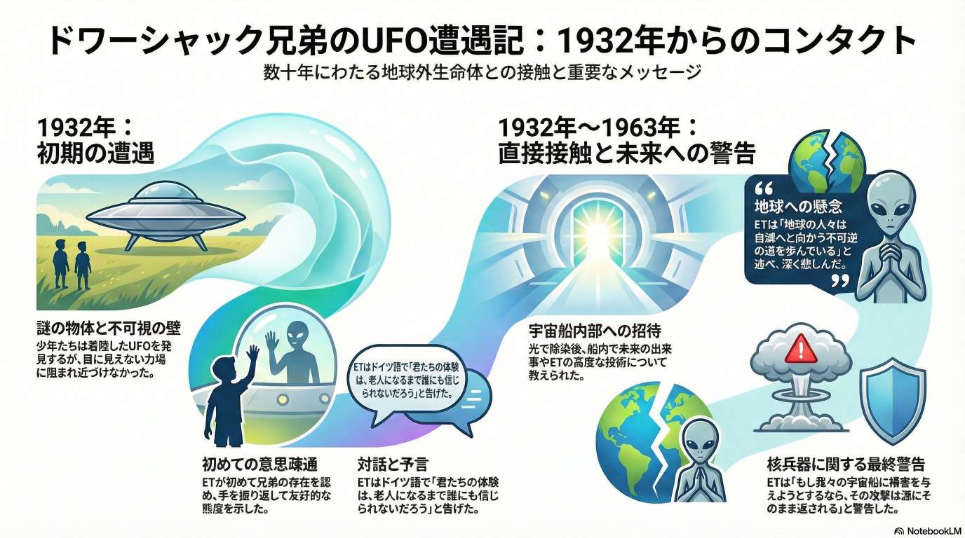 本文書は、1932年から1963年にかけてノースダコタ州およびモンタナ州で発生した、レオ・ドワラックとマイク・ドワラック兄弟による一連のUFO遭遇事件を総合的に分析したものである。この事件は、単なる目撃に留まらず、人間によく似た地球外生命体(ET)との複数回にわたる直接的な対話、宇宙船内部への招待、そして後に現実となった数々の予言を含む、極めて詳細かつ広範な内容を持つ点で特筆される。