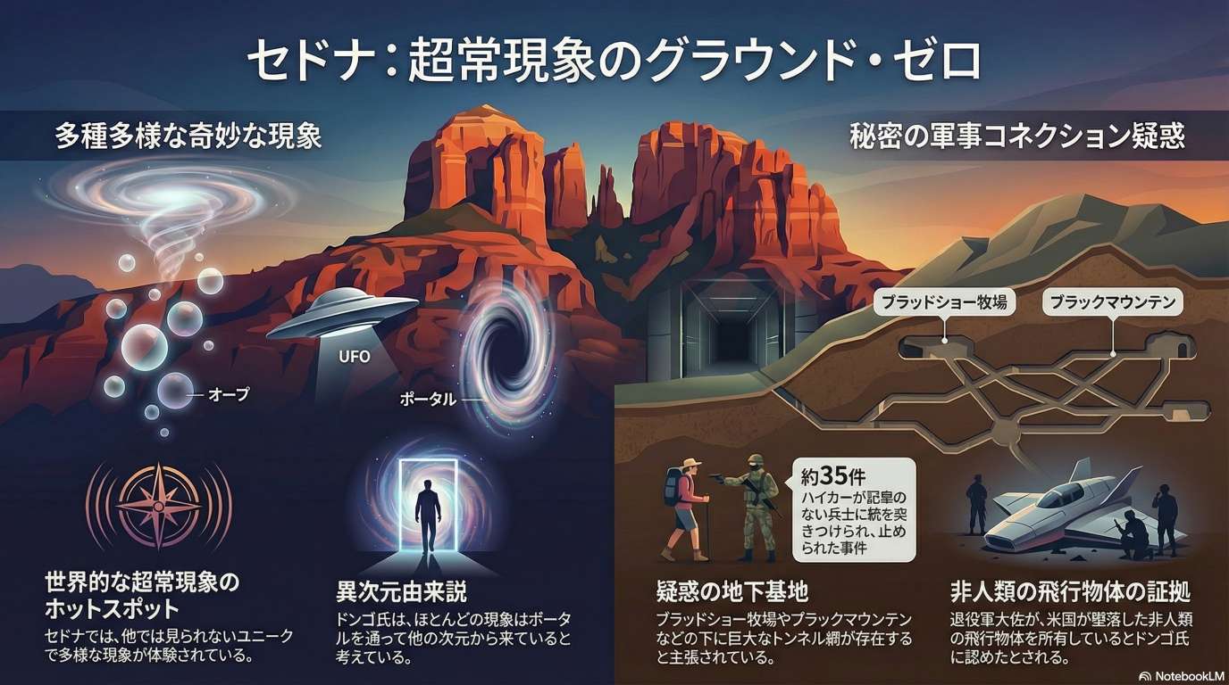 このソースは、Sedona(アリゾナ州セドナ)を超常現象の世界的拠点として長年調査してきた Tom Dongo 氏へのインタビュー記録です。