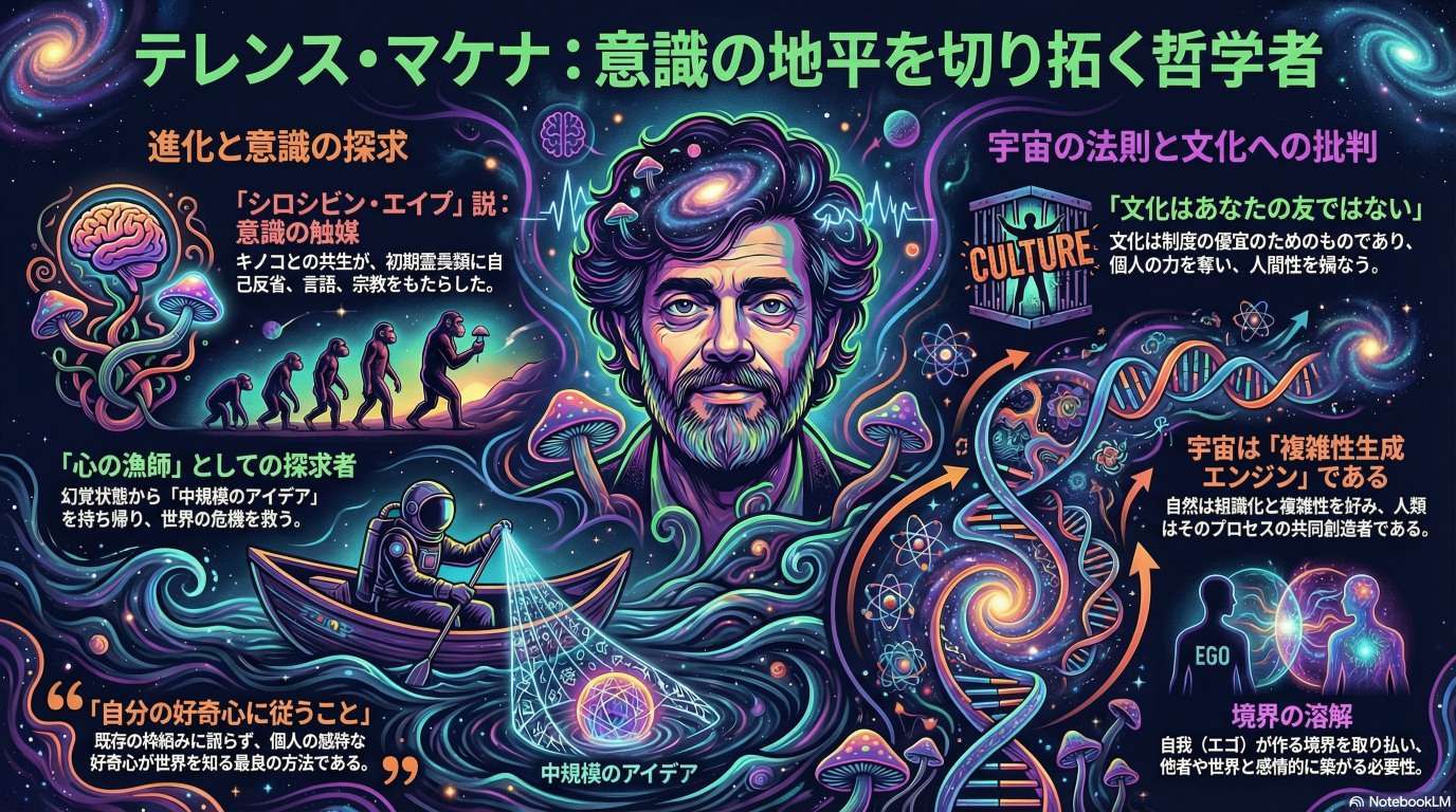 このソースは、思想家 Terence McKenna の貴重な映像群を基に、彼の哲学的信念とサイケデリック体験の本質を解説しています。