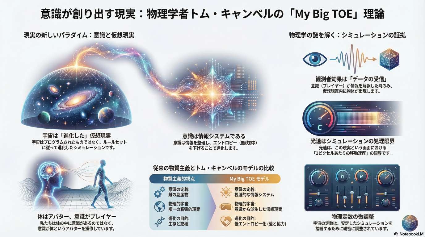 この理論によれば、物理世界は意識のエントロピーを下げるために生成された学習の場であり、量子力学の不可解な現象も仮想現実のルールとして合理的に説明されます。 Campbell は、愛や協力といった主観的な成長こそが進化の目的であり、科学とメタフィジックスは同一の論理で統合できると主張しています。