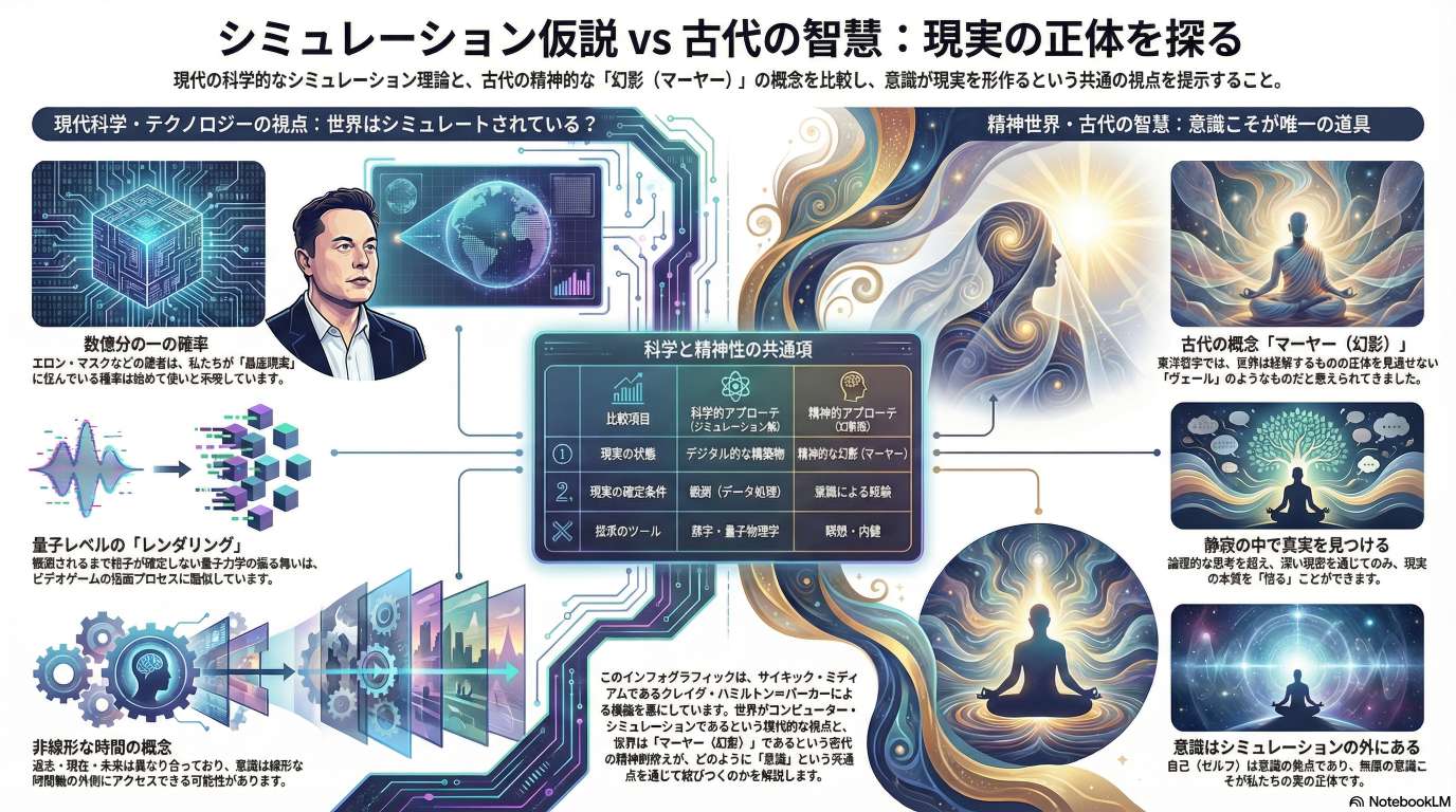 - 現代的背景: Elon Musk(イーロン・マスク)などの著名人がこの問題を真剣に議論していることが指摘されている。AI(人工知能)やVR(仮想現実)が高度に発達した現代において、我々の現実もまた、より高度な存在によって構築されたものであるという考えは、もはや突飛なものではなくなっ ている。統計的にも、我々が「ベース・リアリティ(根源的現実)」ではなくシミュレーション宇宙に存在する可能性の方が高いとする科学者もいる。