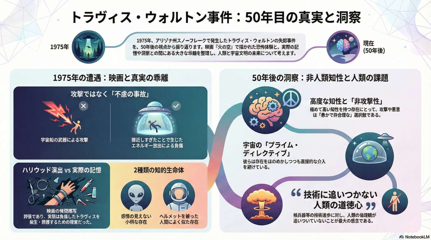1975-11-05 に有名な abduction 体験をした Travis Walton が、事件から 50年後の 2025-09 に長時間の対面インタビューに応じている。このインタビュー動画を AI(NotebookLM) で整理した。このインタビューではこれまで(殆ど?)語られることがなかった情報も含まれている。
