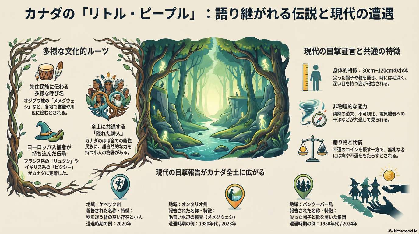 本ブリーフィング文書は、カナダ全土で報告されている「リトルピープル」と呼ばれる存在に関する伝承と、21世紀における目撃証言を統合的に分析するものである。サスカッチやオゴポゴといった著名な未確認生物よりも広範に存在するにもかかわらず、リトルピープルの物語はこれまで注目されることが少なかった。しかし、提供された情報源は、この現象が単なる過去の伝説ではなく、現代においても継続していることを示唆している。