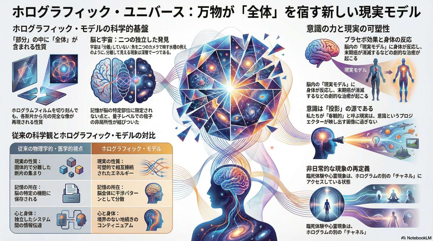 このモデルは、デヴィッド・ボームの量子物理学とカール・プリブラムの脳科学を統合し、宇宙のあらゆる断片が全体の情報を内包しているという革新的な視点を提示しています。宇宙が物理的な固体ではなく、意識と密接に連動した可塑的なエネルギーの干渉パターンであるという考えに基づき、プラセボ効果や遠隔治癒といった現象を説明します。