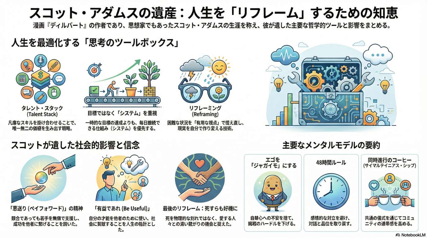 Scott Adams は 2026-01-08 に癌で死去。その追悼式の動画を AI(NotebookLM) で整理した。
