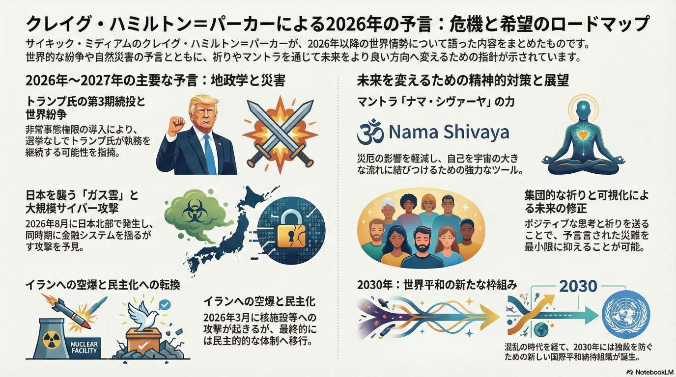 このソースは、サイキック・ミディアムのクレイグ・ハミルトン・パーカー氏が、2026年に向けた不穏な世界情勢の予測を語る動画の書き起こしです。