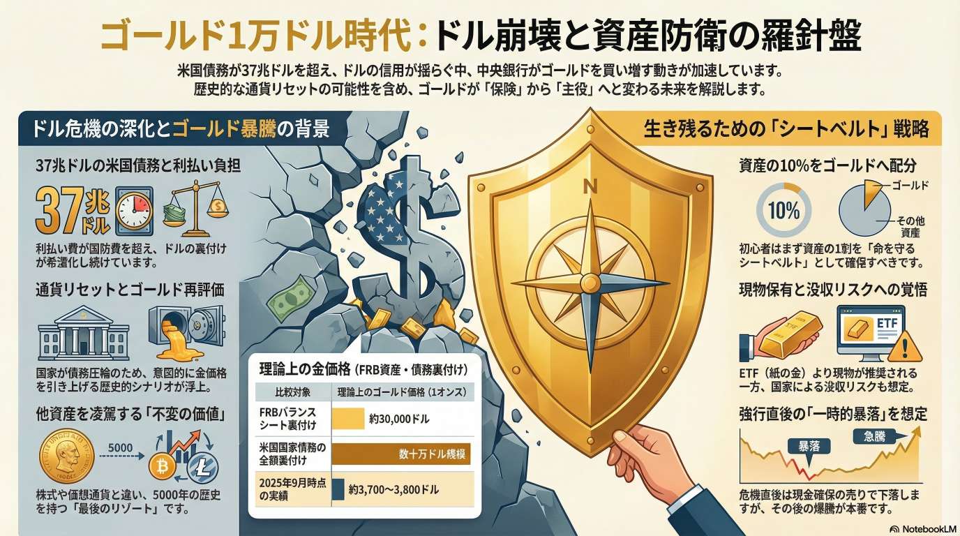 このソースは、世界的な債務超過や米ドルの信用低下を背景に、金価格が1万ドルを超える可能性について詳しく解説しています。
