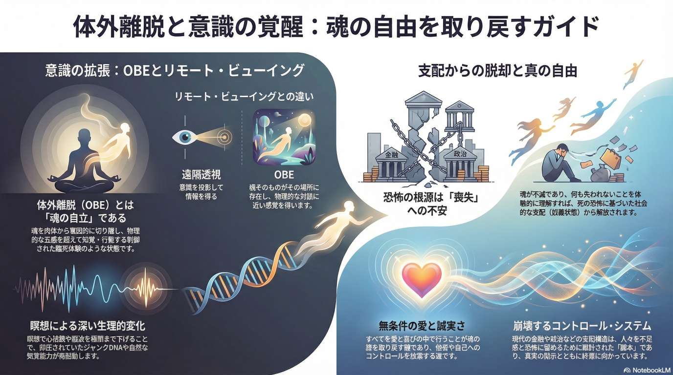 このブリーフィング・ドキュメントは、Alignポッドキャストに出演した Darius J. Wright 氏が提示した主要なテーマと考えを統合したものである。 Wright 氏は、体外離脱体験(OBE)、魂の不滅性、そして人間の隠された能力について詳述している。彼の中核的な主張は、人類は恐怖に基づいた支配システムによって意図的に抑圧されており、真の自由は愛を通して自己の神聖な本質を思い出すことによってのみ達成されるというものである。 Wright 氏は、自身の16歳の時の臨死体験を引き合いに出し、人類が最終的に解放される未来が確定していると断言する。本文書では、リモートビューイング、思考の物理的性質、改ざんされた歴史、地球外生命体の存在、そして現代社会における「奴隷制」の形態といった概念について、彼の見解を詳細に分析する。