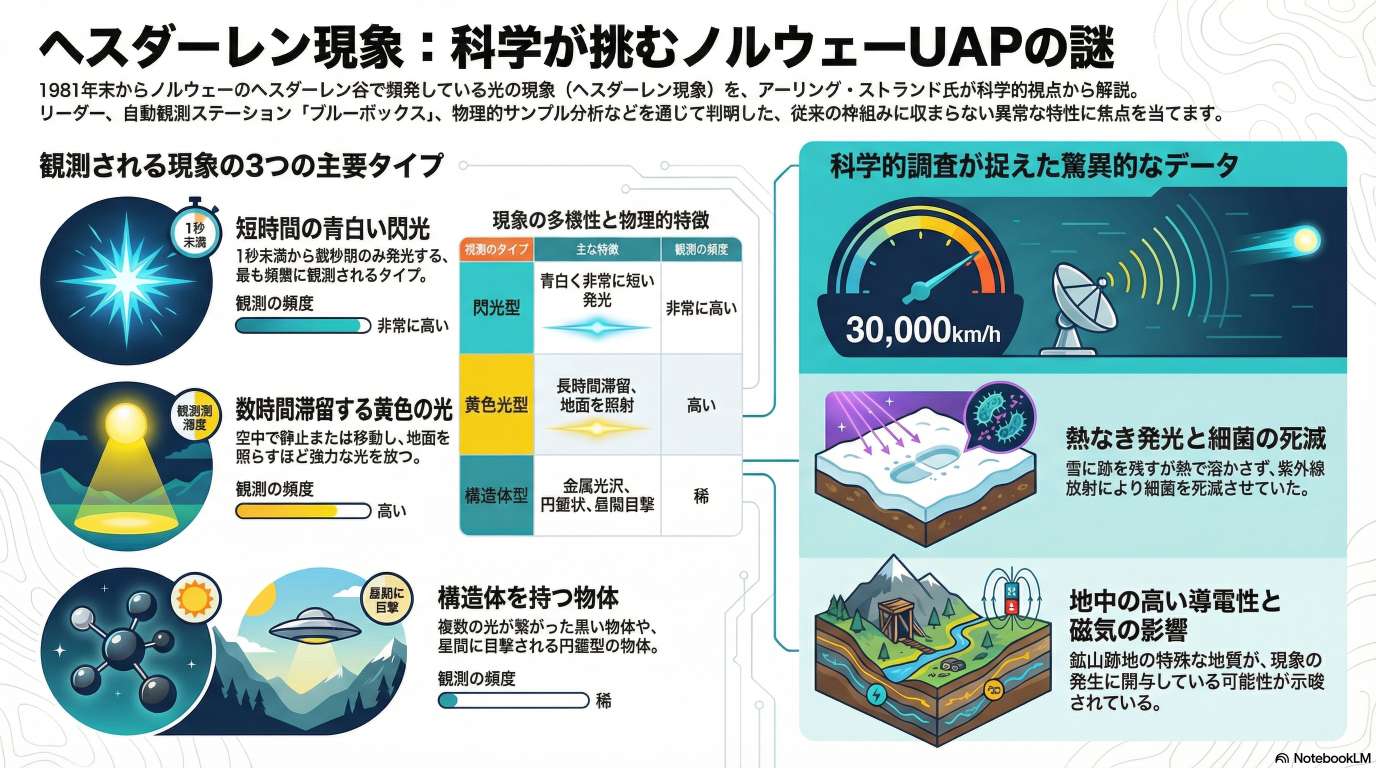 本報告書は、ノルウェーの Hessdalen(ヘスダーレン) (Hessdalen)谷で数十年にわたり観測されている未確認航空現象(UAP)、通称「 Hessdalen(ヘスダーレン) 現象」に関する最新の知見と調査結果をまとめたものである。1980年代初頭から本格的な研究を開始した Erling Strand (Erling Strand)氏へのインタビューに基づき、現象の分類、科学的計測データ、および地質学的な相関関係を詳述する。特筆すべき点として、時速3万キロメートルに達するレーダー観測記録や、肉眼では不可視ながらレーダーには捕捉される物体の存在、さらには地中の高い電気伝導率との関連性が挙げられる。