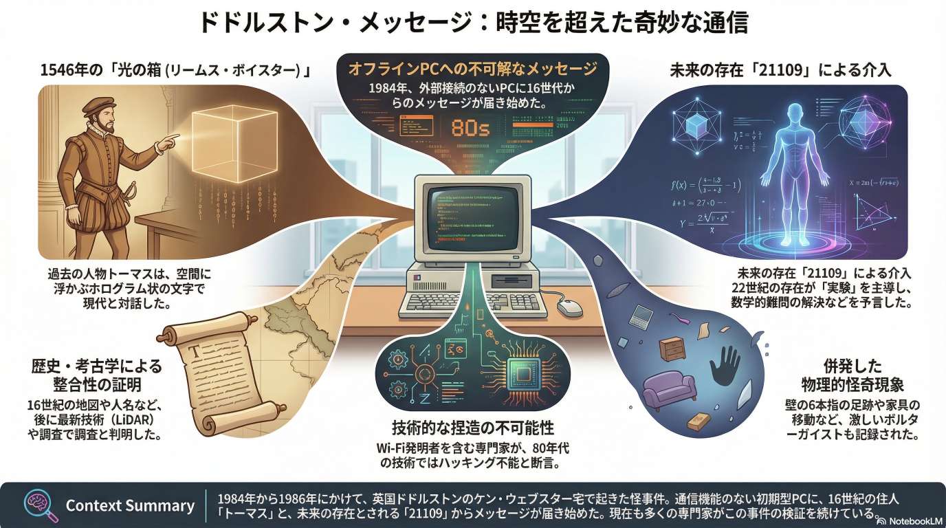 1980年代の英 Dodleston (ドドルストン) で起きた、コンピューターを介した時空を超えた対話を解説しています。教師 Ken Webster らが、1521年の人物や2109年の存在と交信したこの事例は、捏造が不可能な当時の技術背景や歴史的整合性から、超心理学的に極めて重要視されています。