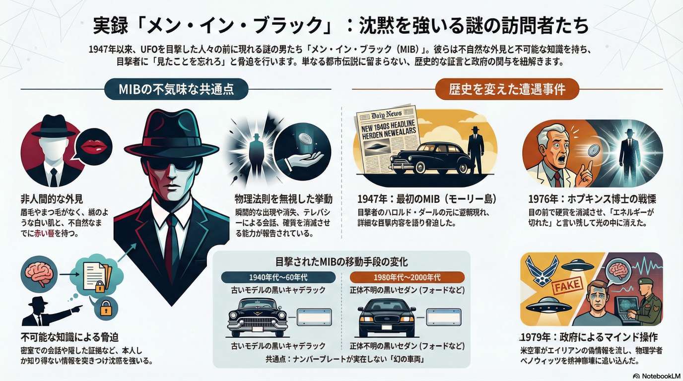 謎のメン・イン・ブラックは、UFO目撃者を脅迫・沈黙させる不気味な存在です。肌が蝋のようで、機械的な声や異常な知識を持つ彼らは、1947年のモーリー島事件から現代まで世界中で報告されています。