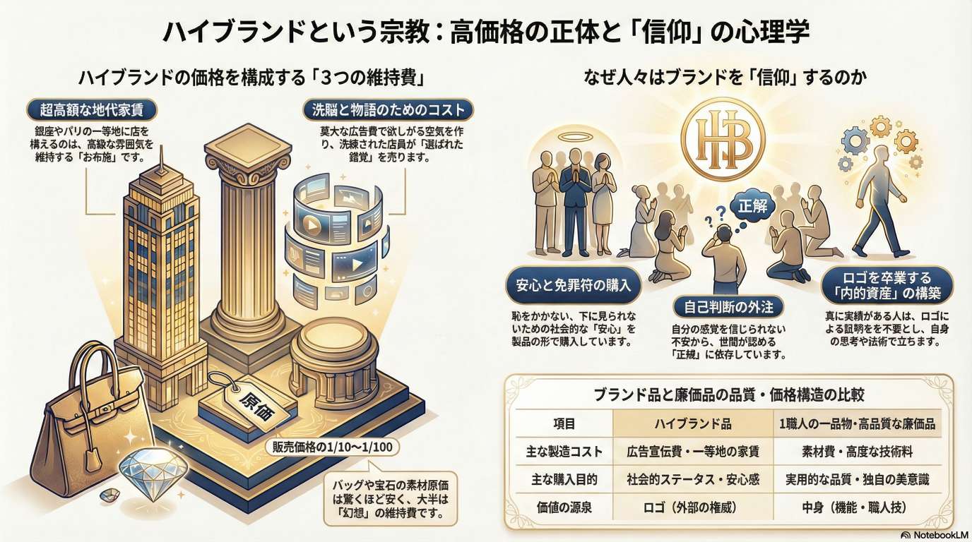 ハイブランドは原価ではなく、広告費や店舗家賃などの「幻想の維持」に多額を投じています。消費者は製品ではなく、不安を解消する免罪符や、自分を正当化する宗教的価値を購入しています。真に実力がある者はロゴに頼らず、自身の思考や美意識という内面的な基準で自立します。