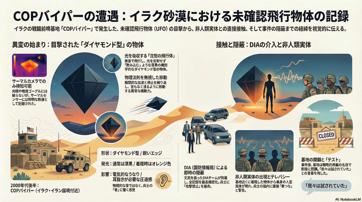本報告書は、イラクのイラン国境付近に位置する戦闘前哨基地(COP)「バイパー」において、第3次派遣中の米軍兵士たちが経験した、一連の未確認飛行物体(UFO/UAP)および未知の生物との遭遇について詳述するものである。