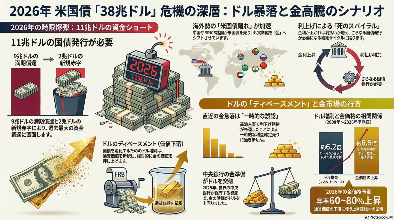 この通貨価値の下落(ディベースメント)により、金価格は再び高騰し、ドルの基軸通貨特権が揺らぐグレートリセットが始まると予測されます。日本も円安加速やインフレ税による資産実質減などの深刻な影響を免れません。