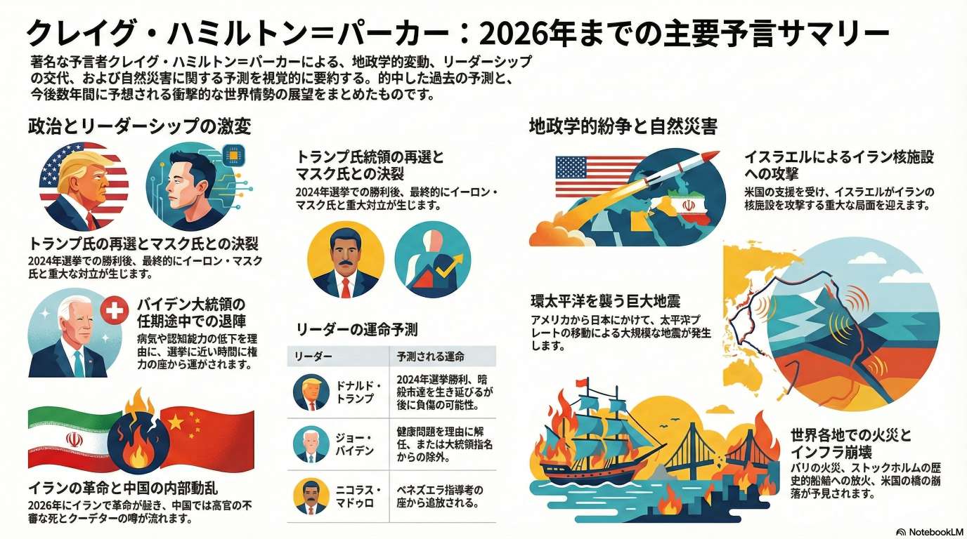 学習者が本資料を活用する際の要点は、単に個々の事象の「的中」を追うことではなく、それらが連鎖して引き起こす**「構造的なパラダイムシフト」**を理解することにあります。複雑に絡み合う政治、地政学、自然災害の予測をカテゴリー別に読み解くことで、動乱の時代におけるリスク管理と未来洞察の視座を養うことができます。
