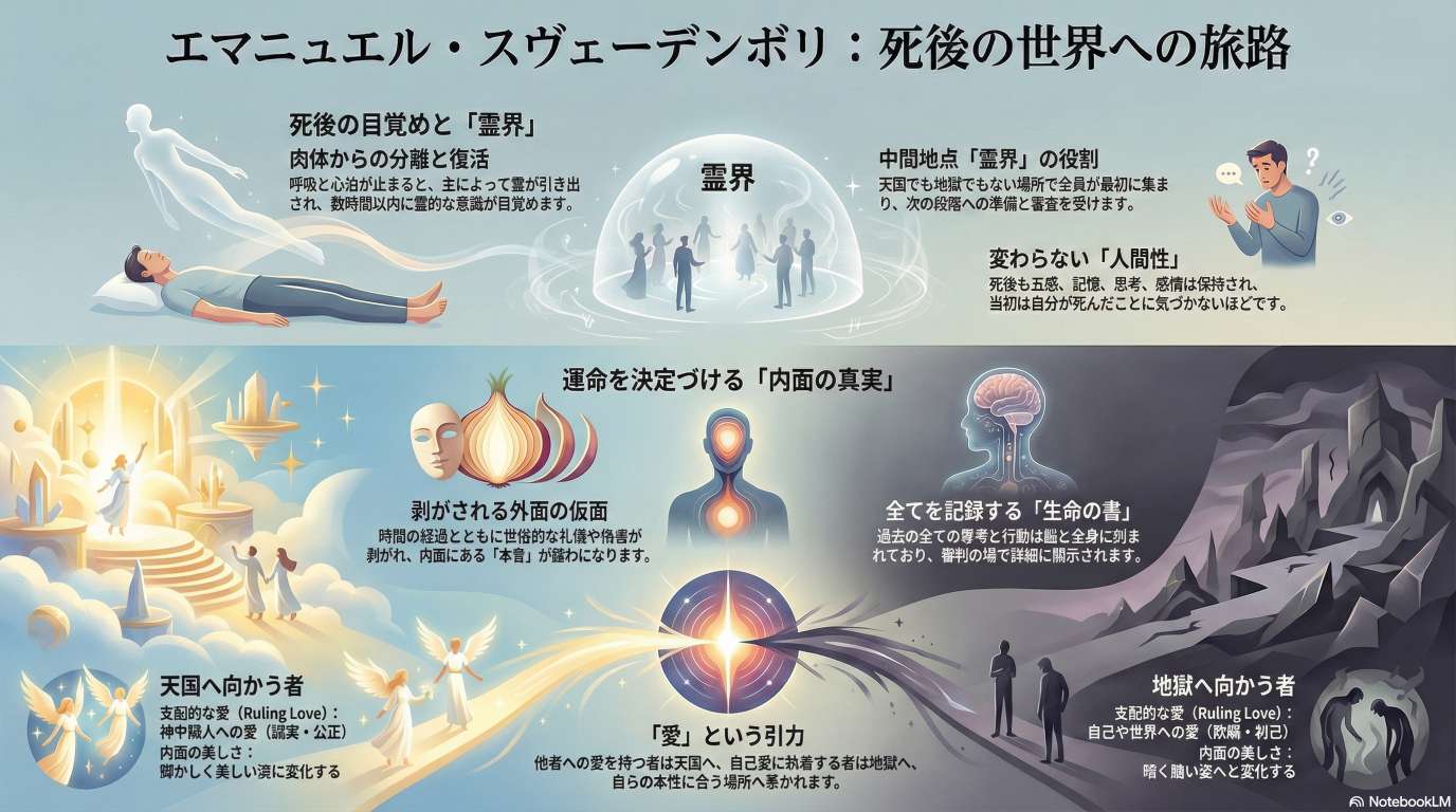 Swedenborg は、科学者から霊能者へ転身し、死後の世界(霊界、天国、地獄)を詳細に記しました。死後、人は自身の支配的愛に基づき、天国か地獄へ引き寄せられます。現世での道徳的・市民的生活を通じ、他者への愛を育むことが霊的成長の鍵となります。