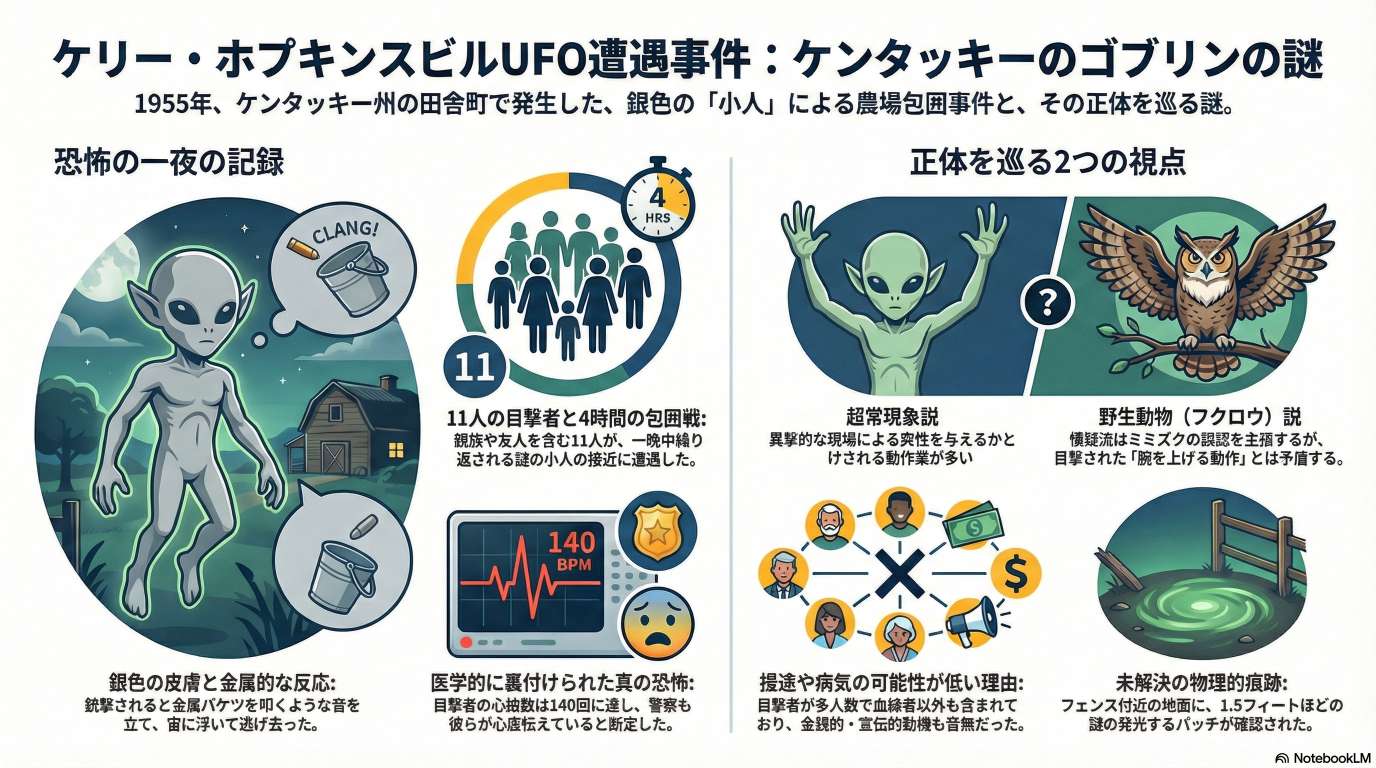 1955年の Kelly-Hopkinsville 事件は、ケンタッキー州の家族が銀色の小人(ゴブリン)に襲撃された不可解な遭遇談です。一家は一晩中銃撃戦を繰り広げ、警察も出動しました。