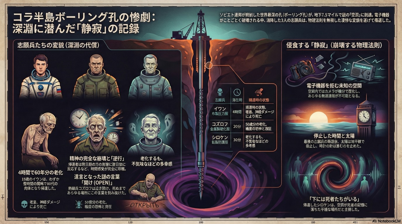 現場責任者の証言によれば、コラ半島の掘削坑は単なる地殻の穴ではなく、我々の物理的現実を 侵食する「未知の領域」への入り口となった。現在、現場周辺では物理的・時間的プロセスが停止しつつあり、外部への連絡手段も断たれている。
