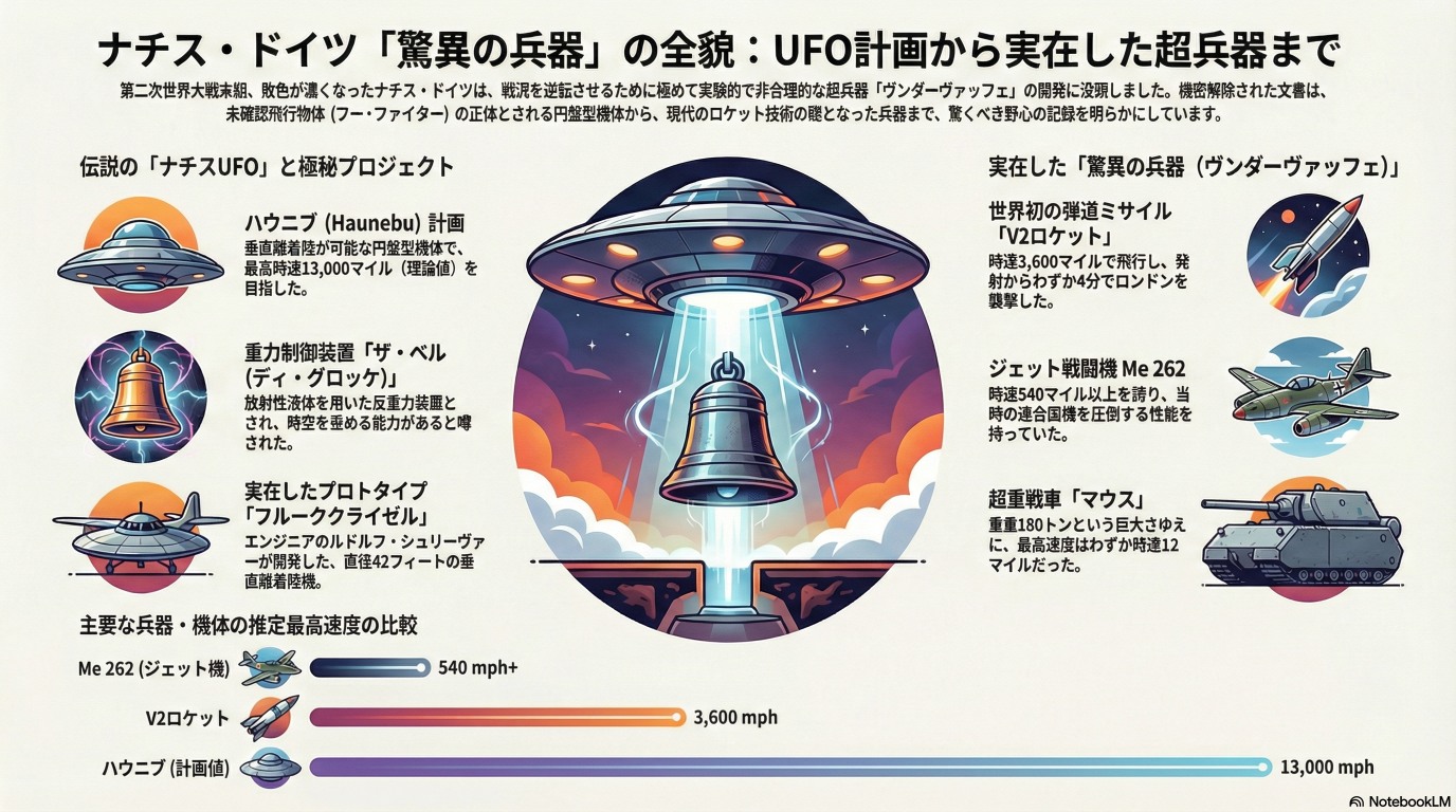 機密文書は、第二次世界大戦中にナチスが開発した空飛ぶ円盤や反重力装置「ザ・ベル」などの驚異的な秘密兵器の実態を明かしています。これらはヴンダーバッフェと 呼ばれ、垂直離着陸や超高速飛行を目指しました。戦後、米ソはペーパークリップ作戦を通じてこれらの高度な技術と科学者を獲得しました。オカルト的な背景を持つこれらの計画は、現代のUFO現象の起源とも目されています。