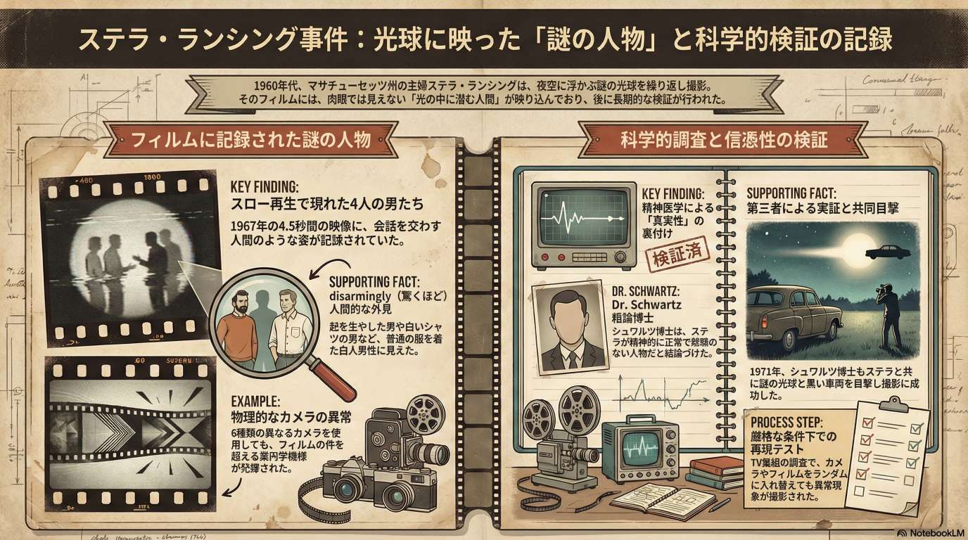 1967年、 Stella Lansing が撮影した発光体の中に、通常速度では見えない4人の男性の姿が記録されていました。精神科医の Dr. Berthold Eric Schwarz はこの映像を本物と判断。彼女の周囲では、物理法則を無視したUFOや謎の黒い車、未踏の音声が記録される怪現象が続きました。