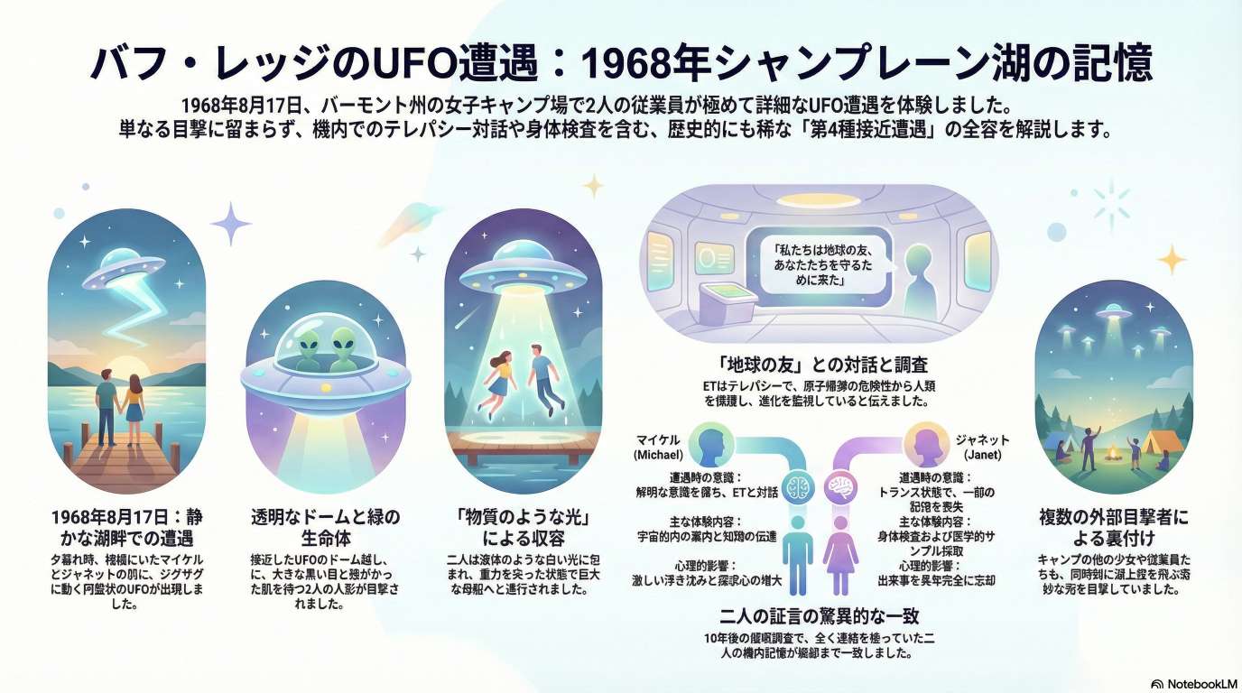 1968年8月17日、バーモント州シャンプレーン湖畔の「バフ・レッジ」女子キャンプ場で発生したUFO遭遇事件は、UFO研究史上極めて重要かつ詳細な記録が残された事例の一つである。主要な目撃者であるマイケル・ラップとジャネット・コーネル(いずれも仮名)は、複数のUFOを目撃しただけでなく、機内に連行され、自称「地球の友」と名乗る地球外生命体(ET)と詳細なコミュニケーションを交わした。