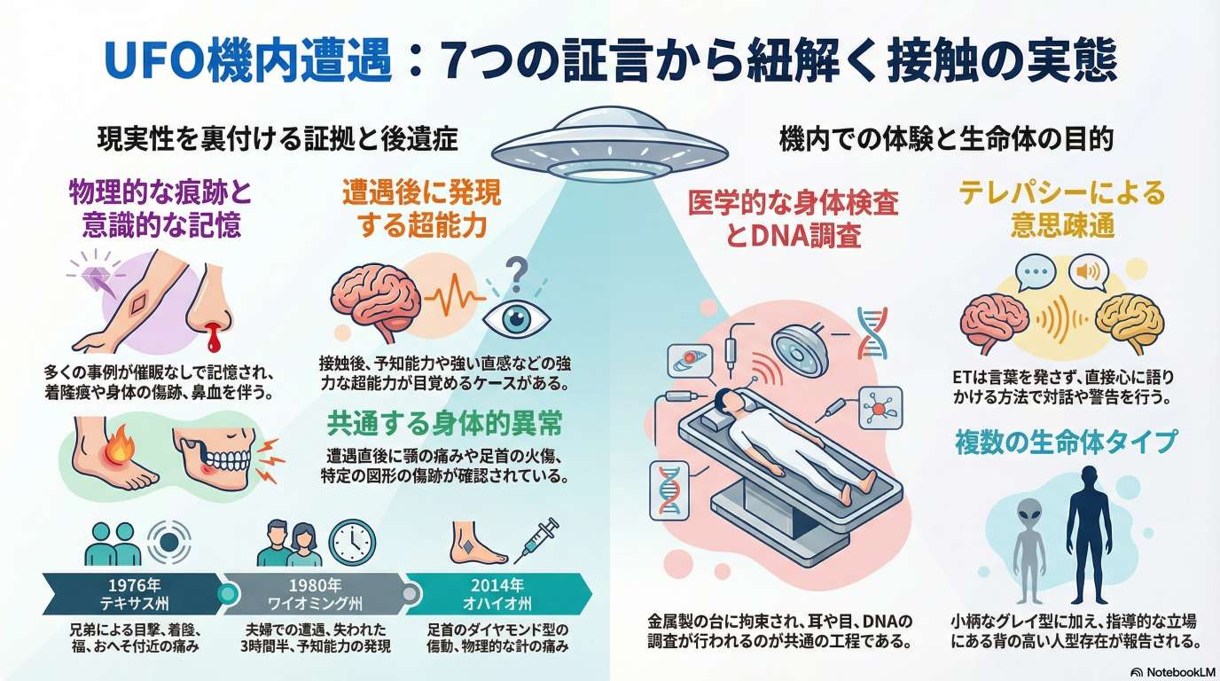 本文書は、1976年から2014年にかけて報告された7つの代表的なUFO機内遭遇事例(オンボード・エンカウンター)を詳細に分析し、その共通項、科学的・生理学的証拠、および目撃者の証言に基づく地球外生命体の行動原理をまとめたものである。