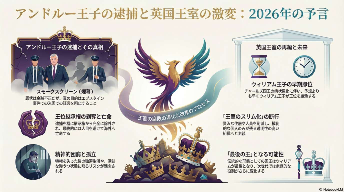 彼は王子の逮捕を、より深刻な性的虐待疑惑から目を逸らすための「煙幕」であると主張し、背後にある政治的取引の可能性を指摘しています。また、チャールズ国王の健康悪化や、ウィリアム王子の代で君主制が終焉を迎える可能性など、英国王室の未来についても自身の見解を述べています。