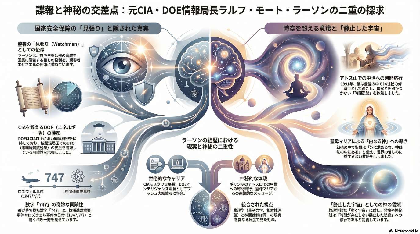 Larssen 氏は自身のキャリアを振り返りながら、14世紀のギリシャへのタイムトラベルや、聖母マリアとの遭遇といった驚くべき神秘体験を詳しく語っています。彼はこれらの超常的な出来事が、核兵器の拡散を監視する「見張り番」としての自身の使命や、信仰心と深く結びついていると主張しています。